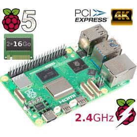 Raspberry-Pi 5 Nano Ordinateur avec CPU 4 Coeurs 2.4 GHz (ARMv8) accompagné de 2 à 16Go RAM, 2 sorties HDMI 4K, un bus PCI express 2.0, une horloge RTC. Support pour WiFi 2.4 & 5 Ghz & Bluetooth 5.0. Interface réseau Ethernet Gigabit (900 mb/s) prêt pour Power Over Ethernet (PoE). 2 ports MiPi pour caméra ou dalle graphique IPS. Connectique USB: 2x USB 2.0 + 2x USB 3.0 à 5 Gbps, ventilateur avec contrôle de vitesse, port UART pour faciliter le debogage.